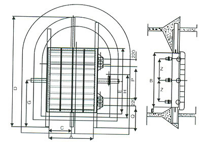防水密闭门用于井下主变电所和主排水泵房通往井底车场的通道,容易关闭,以防止水的突然浸入。本密闭门最大承受压力为98Pa。本密闭门门扇为平钢板、井字筋板、圈梁等组接而成。